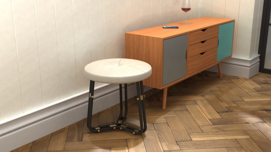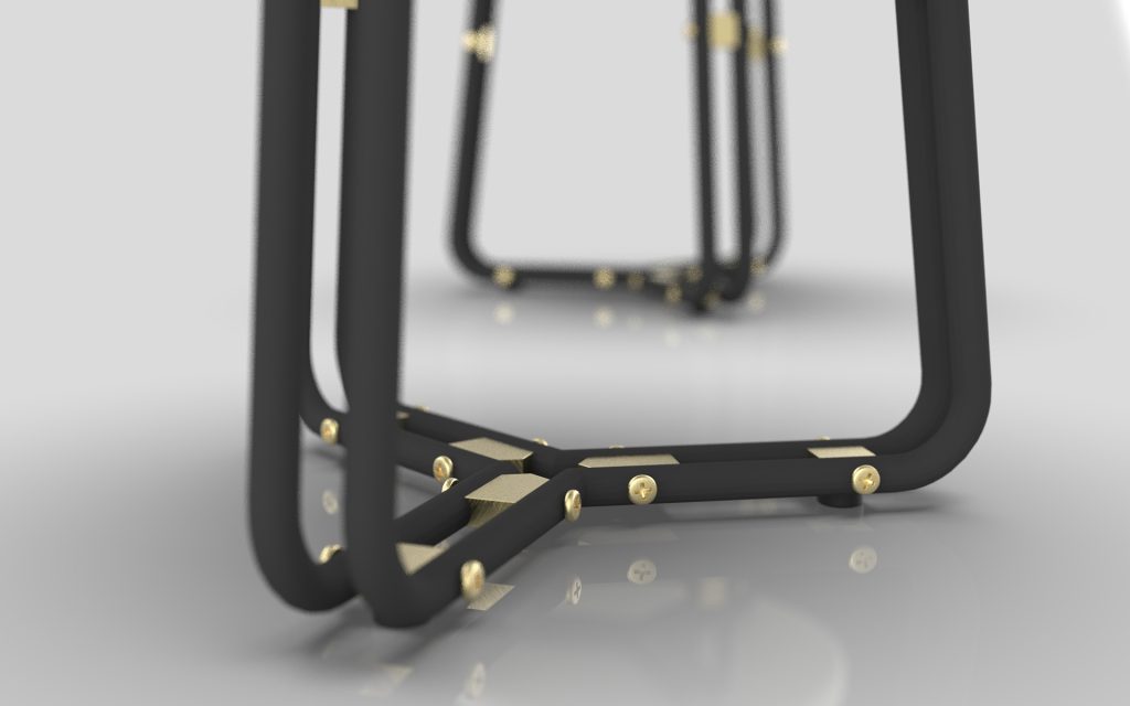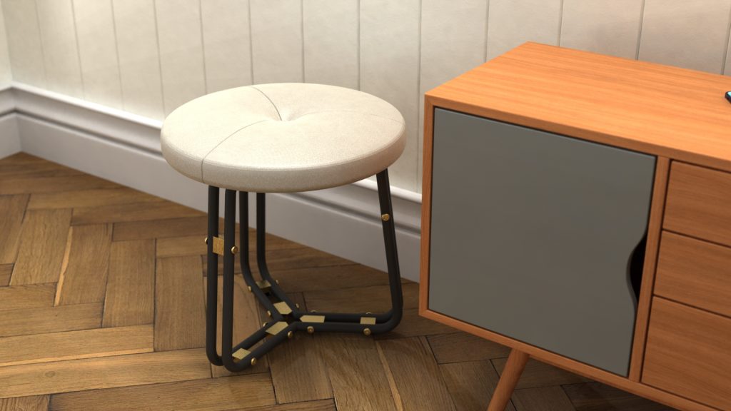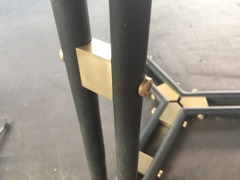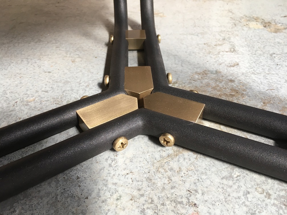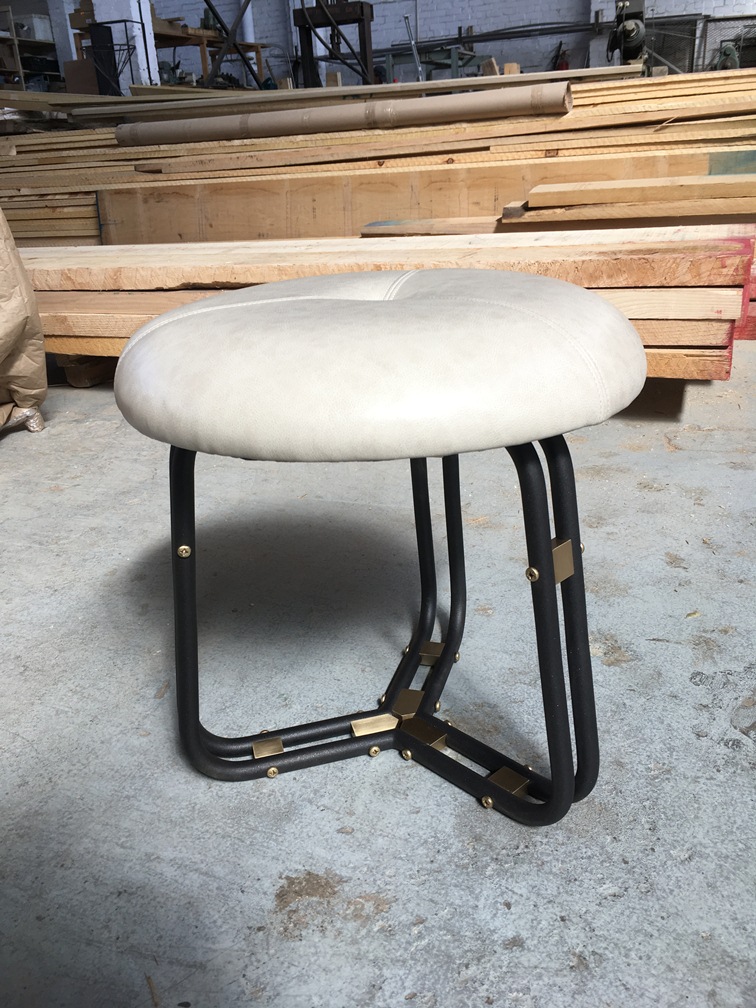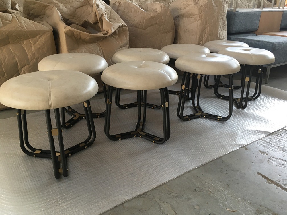 Eight of these custom dresser stools were produced with powder-coated legs and brass spacers. The legs were designed to be assembled in 3 parts, and the brass spacers connect them all together.